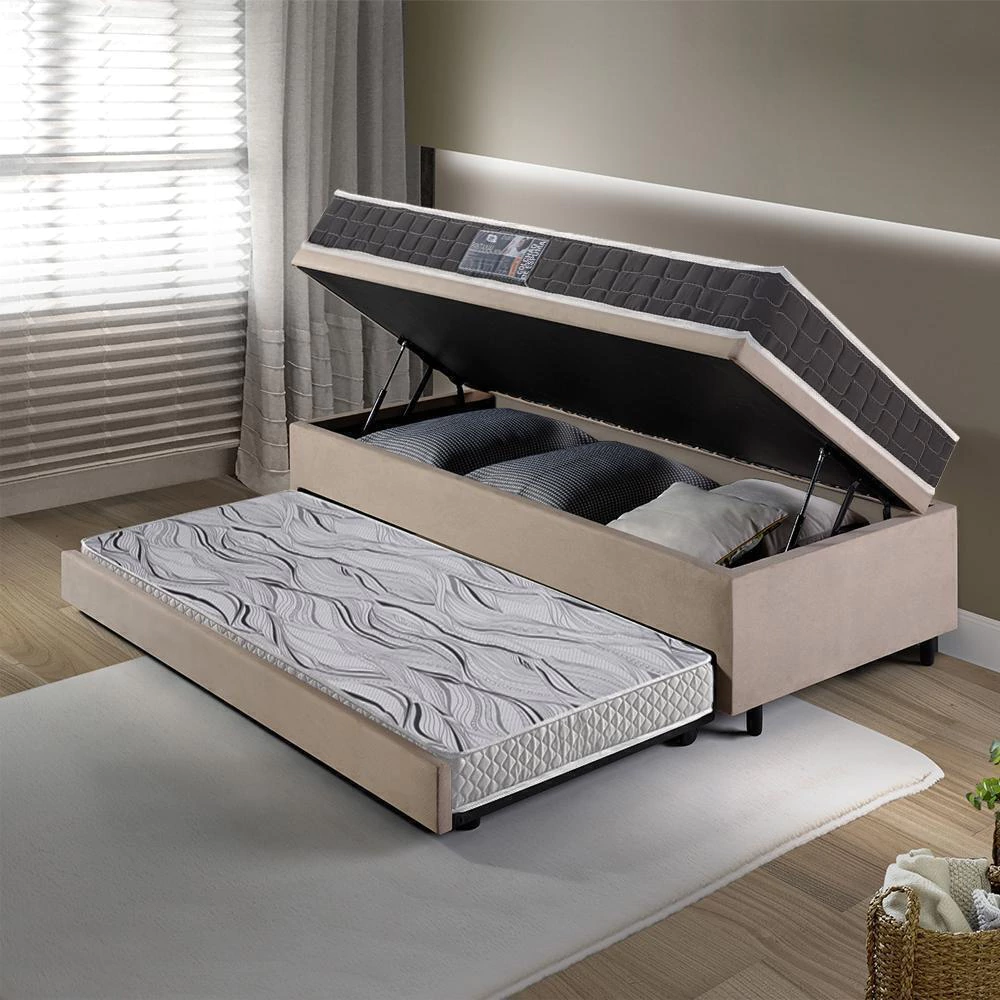 A cama auxiliar, localizada sob o baú, acompanha o colchão móvel de espuma Ecoline D20 Ecoflex (78x177x12 cm), recomendado para uso diário com peso máximo de 60 kg.