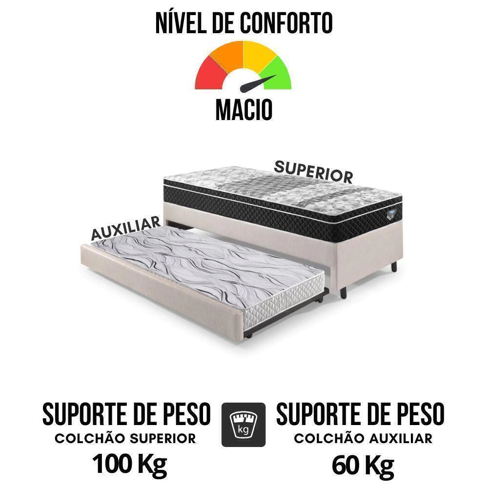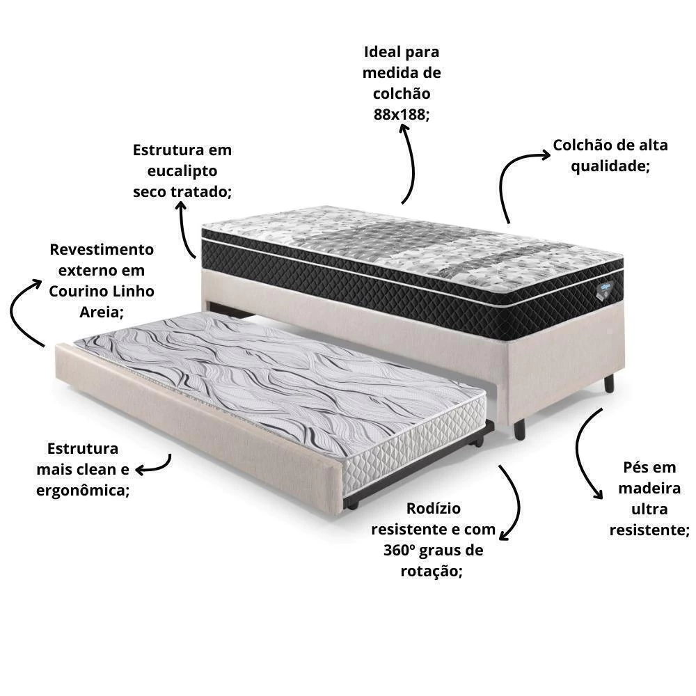 Base Box Solteiro com Auxiliar 88x188x36 cm – Revestimento em Courino Linho Areia + 2 Colchões Ecoflex